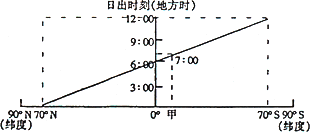 下圖表示某日90°E經(jīng)線上日出時刻隨緯度的變化,讀圖完成下題: