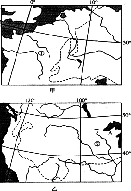 (2)兩圖所示的50°N地區(qū),甲與乙比較甲圖該地區(qū)冬季氣候有什么特點?試分析其原因。