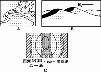(3)根據(jù)等高線數(shù)值判斷,C圖中地形是五種基本類型中的________,判斷理由________;圖上的地質(zhì)構(gòu)造是________,判斷理由是________;此處地形的形成原因是________。