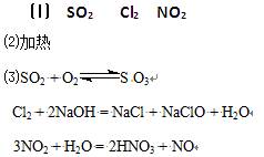 (6分)X、Y、Z三種氣體都能對大氣造成污染,在工業(yè)上都可以用堿液吸收。已知X是化石燃料燃燒的產(chǎn)物之一,是形成酸雨的主要物質(zhì);Y是一種單質(zhì),它的水溶液具有漂白作用;Z是硝酸工業(yè)和汽車尾氣中的有害物質(zhì)之一,能與水反應。請寫出下列反應的方程式。