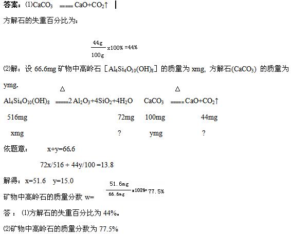 (06年廣東卷)地球化學(xué)中,通常用熱重分析研究礦物在受熱時的質(zhì)量變化以確定其組成。取66.6mg由高嶺石[Al4Si4O10(OH)8]和方解石(CaCO3)組成的礦物,加熱,在673K~1123K區(qū)間內(nèi)分解為氧化物,樣品總失重13.8mg。