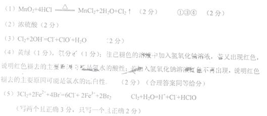(4)F中盛有蒸餾水,C12通過后可觀察到溶液的顏色變?yōu)?u> 色,說明溶液中存在 ;將該溶液加入含有酚酞的氫氧化鈉溶液中,溶液紅色褪去。設(shè)計(jì)實(shí)驗(yàn)探究紅色褪去的原因