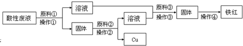 (6分) 刻制印刷電路板得到的酸性廢液中含有大量的FeCl2、CuCl2、FeCl3。為了減少污染并變廢為寶,工程師們?cè)O(shè)計(jì)了如下流程,以常用的酸、堿和廢鐵屑為原料回收銅和制備鐵紅(Fe2O3)。![]()