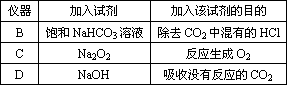 由裝置圖可以看到A為CO2發(fā)生裝置,B、D為洗氣裝置,C中產(chǎn)生O2,E為收集O2的裝置.實驗室中使用大理石(CaCO3)和HCl反應(yīng)制取CO2,會混有少量HCl雜質(zhì),可以用NaHCO3飽和溶液除去,反應(yīng)方程式:NaHCO3+HCl