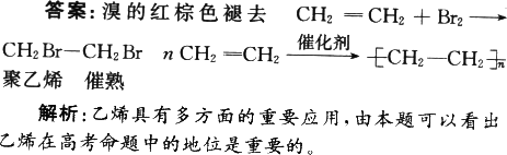 (3)乙烯是石油裂解的主要產(chǎn)物之一,將乙烯通入溴的四氯化碳溶液中,觀察到的現(xiàn)象是 ;其反應(yīng)方程式為 ,乙烯在一定條件下發(fā)生加聚反應(yīng)的化學(xué)方程式是 ,其產(chǎn)物的名稱是 ;乙烯對水果具有 功能。