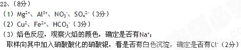 (8分)有一無色透明溶液,欲確定是否含有下列離子:Na+、Mg2+、Al3+、Fe2+、NO3-、SO42-、Cl-、HCO3-、Cu2+,取該溶液實(shí)驗(yàn)如下: