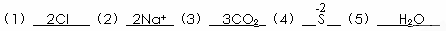 ⑴氯原子 ;⑵2個鈉離子 ;⑶3 個二氧化碳分子 ;⑷-2價的硫元素 ;⑸保持水的化學性質(zhì)的最小粒子 。