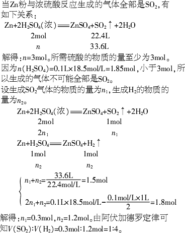 Zn粉與100 mL 18.5 mol/L硫酸充分反應(yīng),Zn粉全部溶解,同時(shí)生成33.6 L氣體A(標(biāo)準(zhǔn)狀況下).將反應(yīng)后的溶液稀釋至1 L,測(cè)得溶液中H+的濃度為0.1 mol/L.計(jì)算氣體A的組分及體積比.