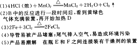 本題要從氯氣的性質(zhì),結(jié)合實(shí)驗(yàn)中的基礎(chǔ)知識和基本技能進(jìn)行綜合分析. 解題的關(guān)鍵是讀懂信息:“該化合物是棕紅色、易潮解,100℃左右時(shí)升華”,然后才有可能對系統(tǒng)進(jìn)行評價(jià)研究. 要使D管中空氣排出,最方便的方法是用剛產(chǎn)生的氯氣去驅(qū)除它,此時(shí)D管不要加熱,待到空氣驅(qū)凈、氯氣充滿D管時(shí)才在D管下加熱,以保證鐵和純氯氣反應(yīng).由于D管中的FeCl3易升華而逸出又特別容易重新冷凝,因此在裝置I中D管出口可能被堵塞,另外多余的氯氣不能被濃H2SO4吸收,排放尾氣時(shí)將導(dǎo)致污染;裝置Ⅱ中D管出口是廣口瓶,可免受堵塞,尾氣排放前有堿液吸收,可防止污染,但FeCl3易潮解,因此應(yīng)在E、F之間加入干燥裝置. |