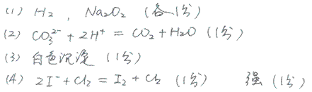 (4)將少量單質(zhì)C通入盛有淀粉KI溶液的試管中,液體變?yōu)樗{(lán)色。該反應(yīng)的離子方程式為 。這說明單質(zhì)C的氧化性 于單質(zhì)碘(填“強(qiáng)”或“弱”)。