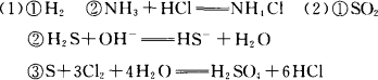 解析:考查的知識點為:元素周期表中元素的單質(zhì)及化合物性質(zhì).本題比較有創(chuàng)意,難度還不大.由X,Y,Z為三個不同短周期非金屬元素的單質(zhì).有了非金屬單質(zhì)的限定,題的難度就等于降低了一半,又Y+X→A(氣),Y+Z→B(氣) (1)若常溫X、Y、Z三單質(zhì)均為氣體,A+B→C冒白煙,這一信息很明顯的確定A、B分別為NH3、HCl,C為NH4Cl 所以Y:H2 X、Z一個為N2,一個為Cl2 NH3+HCl (2)若常溫下Y為固體,X、Z為氣體,A+氧氣→B,由②NaOH+A反應可推知A為酸性氣體,可在空氣中燃燒,應為一種氣態(tài)氫化物.B為一種氧化物(氣體),又由③可知Y與(1)中某單質(zhì)的水溶液反應生成兩種強酸,又是一個重要信息點,(1)中三種單質(zhì)只有Cl2有水溶液.Y為固體單質(zhì),短周期固態(tài)非金屬單質(zhì)能形成強酸的元素只有S(C、Si均為弱酸)故此掌握重要信息點進行細致分析,研究推斷,還有能力完成好此題. 所以A:H2S B:SO2 S+3Cl2+4H2O |