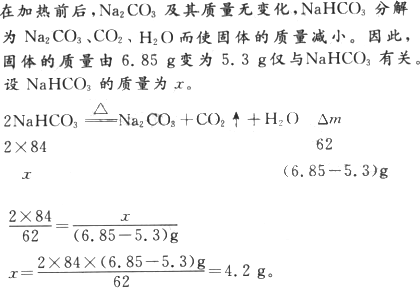 將Na2CO3、NaHCO3的混合物6.85 g充分加熱后,固體的質(zhì)量變?yōu)?.3 g,原混合物中NaHCO3的質(zhì)量是________g.