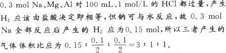 將鈉、鎂、鋁各0.3 mol分別放入100 mL 1 mol·L-1的鹽酸中,同溫同壓下產(chǎn)生的氣體體積比是: ( )