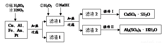 解析試題分析:在酸性環(huán)境中硝酸根離子具有氧化性,只有Au、Pt不能溶于酸和堿,所以濾渣主要成分是Au、Pt,加入過(guò)氧化氫能將溶液中的亞鐵離子完全氧化為鐵離子,加入氫氧化鈉調(diào)節(jié)溶液的pH來(lái)使鐵離子和鋁離子完全沉淀分離出來(lái),濾液2為硫酸銅溶液進(jìn)行蒸發(fā)結(jié)晶就可以得到硫酸銅晶體,濾渣2中含有氫氧化鐵和氫氧化鋁沉淀,加入硫酸可以使其完全溶解,再加入鋁可以置換出硫酸鐵中的鐵,生成了鐵單質(zhì)和硫酸鋁。
