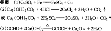 思路與技巧:西漢古籍中記載的“曾青得鐵則化為銅”,也是我們常說(shuō)的濕法煉銅,使用活潑性強(qiáng)的鐵置換活潑性弱的銅.從銅綠[Cu2(OH)2CO3]的化學(xué)式可以看出這是一種堿式鹽,分子中含有OH-、CO32-,肯定能溶于酸,而銅本身不和酸反應(yīng),因此可以選用稀硫酸、稀鹽酸除去銅綠.新制的銅試劑[Cu(OH)2]與葡萄糖反應(yīng)會(huì)生成紅色沉淀的反應(yīng)是葡萄糖結(jié)構(gòu)中醛基的典型性質(zhì). |