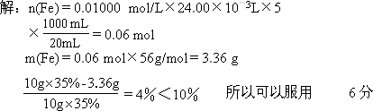 ⑵ “速力菲”是市場上一種常見的補(bǔ)鐵藥物,其中Fe2+的含量為35.0%。該藥品中Fe2+會緩慢氧化。國家規(guī)定該藥物中Fe2+的氧化率超過10%即不能再服用。為檢驗?zāi)乘幍瓿鍪鄣摹八倭Ψ啤笔欠袷,?0.00g該藥品全部溶于稀硫酸,配制成1000mL溶液。取其中20.00mL,用0.01000 mol/L KMnO4溶液滴定,用去KMnO4溶液24.00mL。通過計算說明該藥物是否能服用?(MnO4-在酸性條件下的還原產(chǎn)物為Mn2+,藥品中除Fe元素外其他成分不與KMnO4反應(yīng))