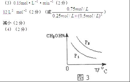 (4)請(qǐng)?jiān)凇皥D3”中畫出平衡時(shí)甲醇百分含量(縱坐標(biāo))隨溫度(橫坐標(biāo))變化的曲線。要求畫壓強(qiáng)不同的2條曲線(在曲線上標(biāo)出P