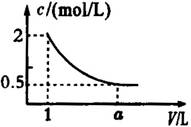 右圖是某溶液稀釋過程中,溶液的物質(zhì)的量濃度隨溶液體積的變化曲線圖,根據(jù)圖中數(shù)據(jù)分析得出a值等于( )。