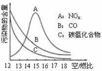 (10分)稀薄燃燒是指汽油在較大空/燃比(空氣與燃油氣的體積比)條件下的燃燒。隨著全球能源危機的加劇,稀薄燃燒技術(shù)的研究受到了人們的重視,但稀薄燃燒時,常用的汽車尾氣凈化裝置不能有效地將NOx轉(zhuǎn)化為N2。不同空/燃比時汽車尾氣中主要污染物的含量變化如右圖所示。