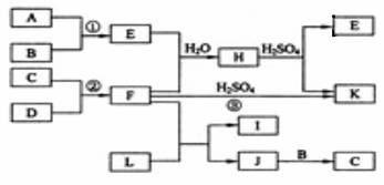 下圖是部分短周期元素的單質(zhì)及其化合物的轉(zhuǎn)化關(guān)系圖(有關(guān)反應(yīng)的條件及生成的H2O已略去),已知:(a)A、B、C、D是非金屬單質(zhì),其中B、C、D在常溫常壓下是氣體。(b)反應(yīng)①②是化工生產(chǎn)中的重要反應(yīng)。(c)化合物E是形成酸雨的污染物之一,化合物K是常用的氮肥。(d)化合物L(fēng)具有漂白性,可由Cl2與NaOH溶液反應(yīng)而制得。(e)化合物J由兩種元素組成,其相對分子質(zhì)量為32。