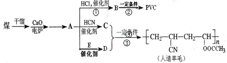 (13分)、近年來,由于石油價格不斷上漲,以煤為原料制備一些化工產(chǎn)品的前景又被看好。下圖是以煤為原料生產(chǎn)聚氯乙烯(PVC)和人造羊毛的合成路線。