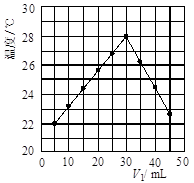 將V1 mL 1.0 mol/L HCl溶液和V2 mL未知濃度的NaOH溶液混合均勻后測量并記錄溶液溫度,實(shí)驗結(jié)果如圖所示(實(shí)驗中始終保持V1+V2=50 mL)。下列敘述正確的是( )