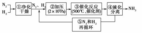 1913年德國(guó)化學(xué)家哈伯發(fā)明了以低成本制造大量氨的方法,從而大大滿足了當(dāng)時(shí)日益增長(zhǎng)的人口對(duì)糧食的需求。下列是哈伯法的流程圖,其中為提高原料轉(zhuǎn)化率而采取的措施是( )