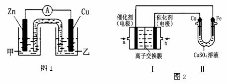 ①圖1是根據(jù)反應(yīng)Zn+CuSO4===Cu+ZnSO4設(shè)計(jì)成的鋅銅原電池。Cu極的電極反應(yīng)式是 ,鹽橋中是含有瓊膠的KCl飽和溶液,電池工作時(shí)K+向 移動(dòng)(填“甲”或“乙”)。
