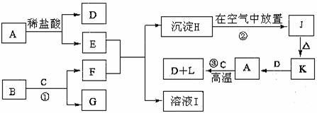下列為一些常見物質(zhì)的相互轉(zhuǎn)化關(guān)系圖。已知:A是金屬單質(zhì),B為淡黃色粉末,C在常溫下為無色液體,J為紅褐色固體。