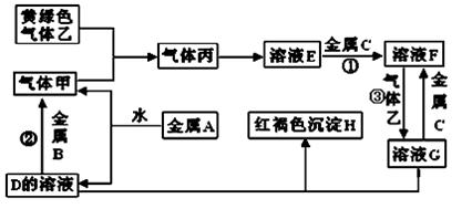 有三種金屬單質(zhì)A、B、C,其中A的焰色反應(yīng)為黃色,B、C是常見金屬。甲、乙、丙為氣體,它們與物質(zhì)D、E、F、G、H之間發(fā)生如下轉(zhuǎn)化關(guān)系(圖中有些反應(yīng)的產(chǎn)物和反應(yīng)的條件沒有全部標(biāo)出)。