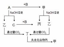 由短周期元素組成的單質(zhì)A、B、C和甲、乙、丙、丁四種化合物有圖示的轉(zhuǎn)化關(guān)系,已知A是金屬單質(zhì),C是相同狀況下密度最小的氣體,甲是電解質(zhì)。