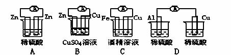 有A、B、C、D四種金屬。將A與B用導(dǎo)線連接起來,浸入稀硫酸溶液中,B為正極。將A、D分別投入等濃度鹽酸中,D比A反應(yīng)劇烈。將銅浸入B的鹽溶液里,無明顯變化。如果把銅浸入C的鹽溶液里,有金屬C析出。據(jù)此判斷它們的活動性由強到弱的順序是 ( )