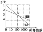 HA和HB兩種酸的溶液分別加水稀釋時,pH變化的簡圖如圖所示,下列敘述錯誤的是 ( )