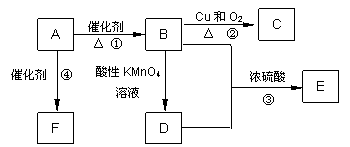 已知:A是略帶甜味氣體,可作為果實(shí)的催熟劑。E是具有果香味的有機(jī)物,F(xiàn)是一種高聚物,可制成多種包裝材料。