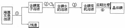 海藻中含有豐富的、以離子形式存在的碘元素.下圖是實(shí)驗(yàn)室從海藻里提取碘的流程的一部分。