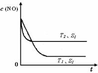 2CO2(g)+ N2(g) 中NO的濃度隨溫度(T)、催化劑表面積(S)和時間(t)的變化曲線,據(jù)此判斷該反應(yīng)的△H 0 (填“>”、“<”或“無法確定”)。若催化劑的表面積S1>S2 ,在右圖中畫出NO的濃度在T1、S2 條件下達(dá)到平衡過程中的變化曲線,并注明條件。