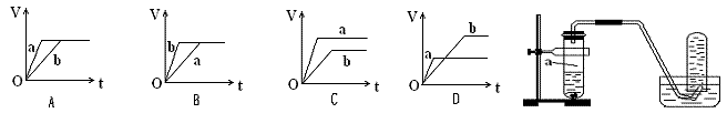 向等質(zhì)量的a、b兩份鋅粉中,分別加入過量的稀H2SO4,同時(shí)向a中加入少量的CuSO4溶液。下圖表示產(chǎn)生H2的體積(V)與時(shí)間(t)的關(guān)系,其中正確的是