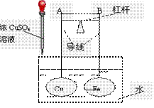 如圖所示,杠桿AB兩端分別掛有體積相同、質(zhì)量相等的空心銅球和空心鐵球,調(diào)節(jié)杠桿并使其在水中保持平衡,然后小心地向水槽中滴入濃CuSO4溶液,一段時(shí)間后,下列有關(guān)杠桿的偏向判斷正確的是(實(shí)驗(yàn)中,不考慮兩球的浮力變化)