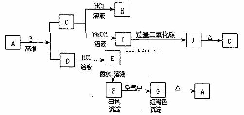 A是一種紅棕色金屬氧化物,B、D是金屬單質(zhì),J是一種難溶于水的白色化合物,受熱后容易發(fā)生分解。