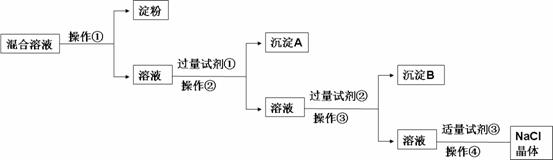NaCl溶液中混有Na2SO4、CaCl2溶液和淀粉膠體,選擇適當?shù)脑噭┖头椒◤闹刑峒兂鯪aCl晶體。相應的實驗過程如下: