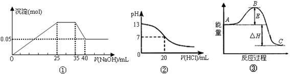 | A.圖①表示向含Mg2+、Al3+、NH4+的鹽溶液中滴加NaOH溶液時,沉淀的量與NaOH的體積的關系圖。則三種離子的物質(zhì)的量之比為:n(Mg2+)∶n(Al3+):n( NH4+)=2∶3∶2 |