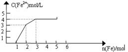 某稀溶液中含有Fe(NO3)3、Cu(NO3)2、HNO3,向其中逐漸加入鐵粉,溶液中Fe2+濃度和加入鐵粉的物質(zhì)的量之間的關(guān)系如下圖所示。則溶液中Fe(NO3)3、Cu(NO3)2、HNO3物質(zhì)的量濃度之比為![]()