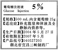 (3)病人輸液用的葡萄糖注射液是葡萄糖(化學(xué)式為:C6H12O6)的水溶液,其標(biāo)簽上的部分內(nèi)容如右圖所表示.利用標(biāo)簽所提供的信息,回答下列問題: ![]()