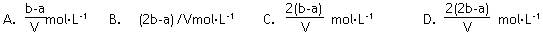 把V L含有MgS04和K2S04的混合溶液分成兩等份,一份加入含a mol NaOH的溶液,恰好使鎂離子完全沉淀為氫氧化鎂:另一份加入含b mol BaCl2的溶液,恰好使硫酸根離子完全沉淀為硫酸鋇。則原混合溶液中鉀離子的濃度為![]()