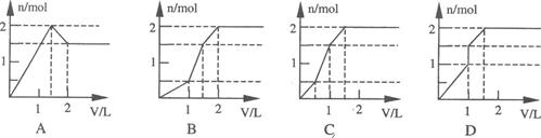 向含lmolHCl和lmolMgSO4的混合溶液中加入lmol·L-1Ba(OH)2溶液,產(chǎn)生沉淀的物質(zhì)的量(n)與加入Ba(OH)2溶液體積(V)間的關(guān)系圖正確的是![]()