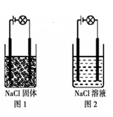 某化學(xué)興趣小組按圖示裝置進行實驗,觀察到的實驗現(xiàn)象為:圖1燈泡不亮,圖2燈泡亮,由此得出的結(jié)論正確的是 ![]()