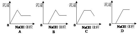 在含有Fe3+、Al3+、H+的溶液中滴加NaOH溶液時(shí),下列關(guān)于生成沉淀的質(zhì)量與滴入NaOH溶液體積的關(guān)系,圖示中正確的是![]()