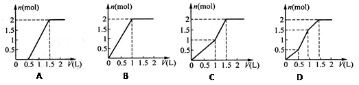 用含1 mol HCl的鹽酸酸化含1 mol MgSO4的溶液,當向其中滴加1 moI·L-1的Ba(OH)2溶液時,產(chǎn)生沉淀的物質的量(n)與加入Ba(OH)2溶液體積(V)間的關系圖正確的是 ![]()