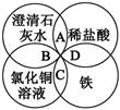 鐵、稀鹽酸、澄清石灰水、氯化銅溶液是中學(xué)化學(xué)中常見物質(zhì),四種物質(zhì)間的反應(yīng)關(guān)系如下圖所示。圖中兩圓相交部分(A、B、C、D)表示物質(zhì)間的反應(yīng),其中對(duì)應(yīng)反應(yīng)的離子方程式書寫正確的是 ( )![]()