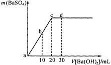 常溫下,向0.1mol/L的硫酸溶液中逐滴加入物質(zhì)的量濃度相同的氫氧化鋇溶液,生成沉淀的量與加入氫氧化鋇溶液的體積關(guān)系如圖所示,a、b、c、d分別表示實(shí)驗(yàn)時(shí)不同階段的溶液,下列有關(guān)說法中不正確的是![]()